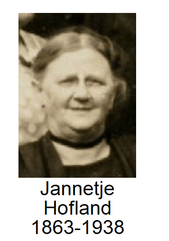 | 7. | Jannetje Maria Hofland, geb. te Naaldwijk op 31 mrt 1864119, ovl. te Orange City[Usa] in 1951, tr. circa 1890 met Herman Vollink, geb. te Hilten[Deu] op 8 mei 1848, ovl. te Orange City[Usa] in 1930. Uit dit huwelijk geen kinderen. |