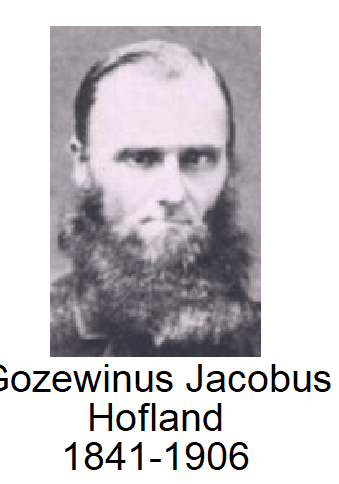 | Vc. | Gozewinus Jacobus Hofland, zn. van Jan Hofland (IVc) en Jannetje Klapwijk, geb. te Naaldwijk op 12 apr 184177, tuinder te Naaldwijk, ovl. te Naaldwijk op 25 mrt 190678, tr. te Naaldwijk op 3 nov 1860133 met Jannetje Kuijvenhoven, dr. van Arij Kuijvenhoven en Johanna Hofland, geb. te Naaldwijk op 15 mrt 1841134, ovl. te Naaldwijk op 12 jan 1912. |