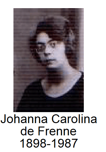 | 7. | Johanna Carolina (Jo) de Frenne188, geb. te Kampen op 13 feb 1898187, ovl. te Naaldwijk op 17 apr 1987189, tr. te 's-Gravenzande op 6 aug 1958 met Klaas Andeweg190, zn. van Jan Andeweg en Geertje Geertrui Ruitenberg, geb. te Naaldwijk op 13 jun 1896190,190, ovl. te Naaldwijk op 22 mrt 1977190, (Klaas tr. (1) te Naaldwijk op 25 okt 1922 met Krijna Willemina Steenks, dr. van Frans Leendert Steenks en Krijna Willemina Hofland.). Uit dit huwelijk geen kinderen. |