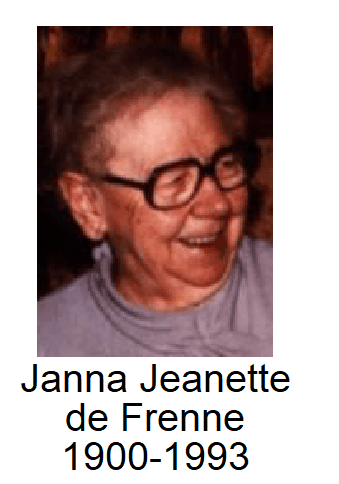 | 8. | Janna Jeanette Gozeriena (Jannie) de Frenne, geb. te Kampen op 13 nov 1900191, ovl. te Apeldoorn op 28 nov 1993192, tr. te Twello op 23 aug 1933 met Gerrit Jansen, zn. van Harmen Jansen en Hendrika Horst, geb. te Twello op 12 okt 1905, ovl. te Deventer op 28 feb 1983. Uit dit huwelijk 5 kinderen. |