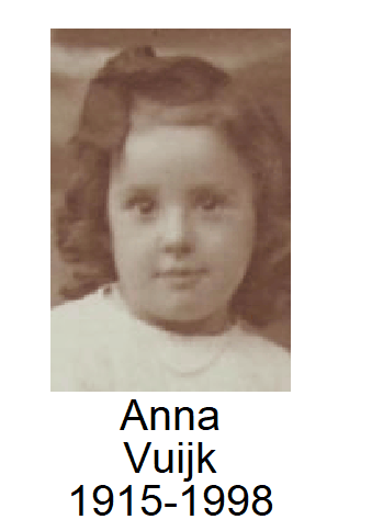 | 4. | Anna (Ans) Vuijk32, geb. te Rotterdam op 6 okt 1915, ovl. te Rotterdam op 7 apr 199837, volgt XIIc. |