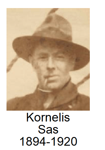 | 1. | Kornelis (Kees) Sas, geb. te Vlaardingen op 26 jan 189480, ovl. op 19 mrt 1920. |